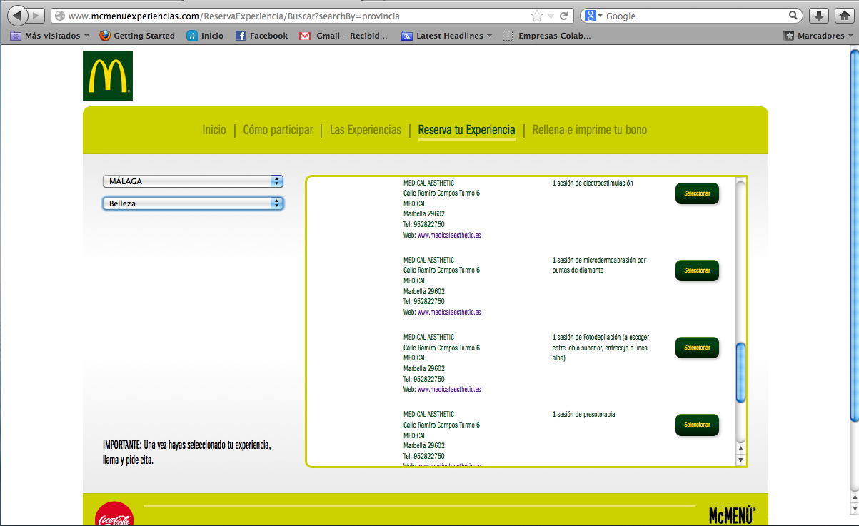 Por tanto decido llamar a la franquicia MEDICAL AESTHETIC quien me comenta que no tienen ningún centro en la zona (ni en muchos kilómetros alrededor) y muy amablemente me da el teléfono de Mcdonald´s, alegando que “ellas no pueden hacer nada, pero que llame al restaurante. Por su parte pondrán una queja porque en otras ocasiones pasadas han tenido problemas con Mcdonald´s” Que digo yo que para que repites.