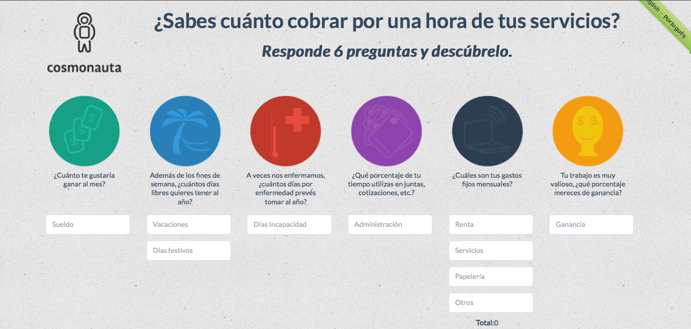 Exactamente es una página desarrollada por Cosmonauta, agencia mexicana de innovación dedicada a la conceptualización, desarrollo e implementación de proyectos digitales. Por esta misión han decidido crear una web donde contestando a unos sencillos parámetros podrás saber en dólares (tu ya lo pasas a euros, no lo iban a hacer todo ellos/as) cuánto cuesta tu hora de trabajo: