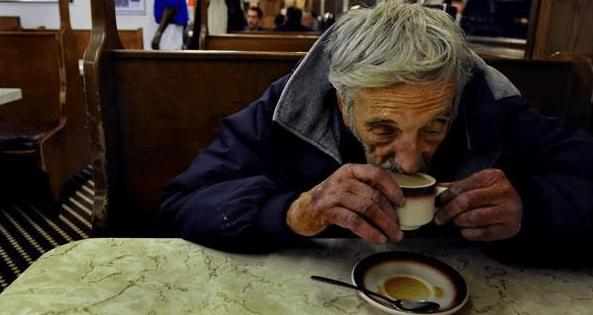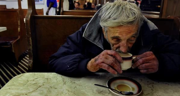 Pagan por siete, se toman los tres y se marchan. Después un joven pide dos cafés, bebe sólo uno, pero paga los dos. Estamos sentados, hablamos y miramos a través de la puerta abierta la plaza iluminada por el sol delante de la cafetería. De repente, en la puerta aparece un hombre vestido muy pobre y pregunta en voz baja:
