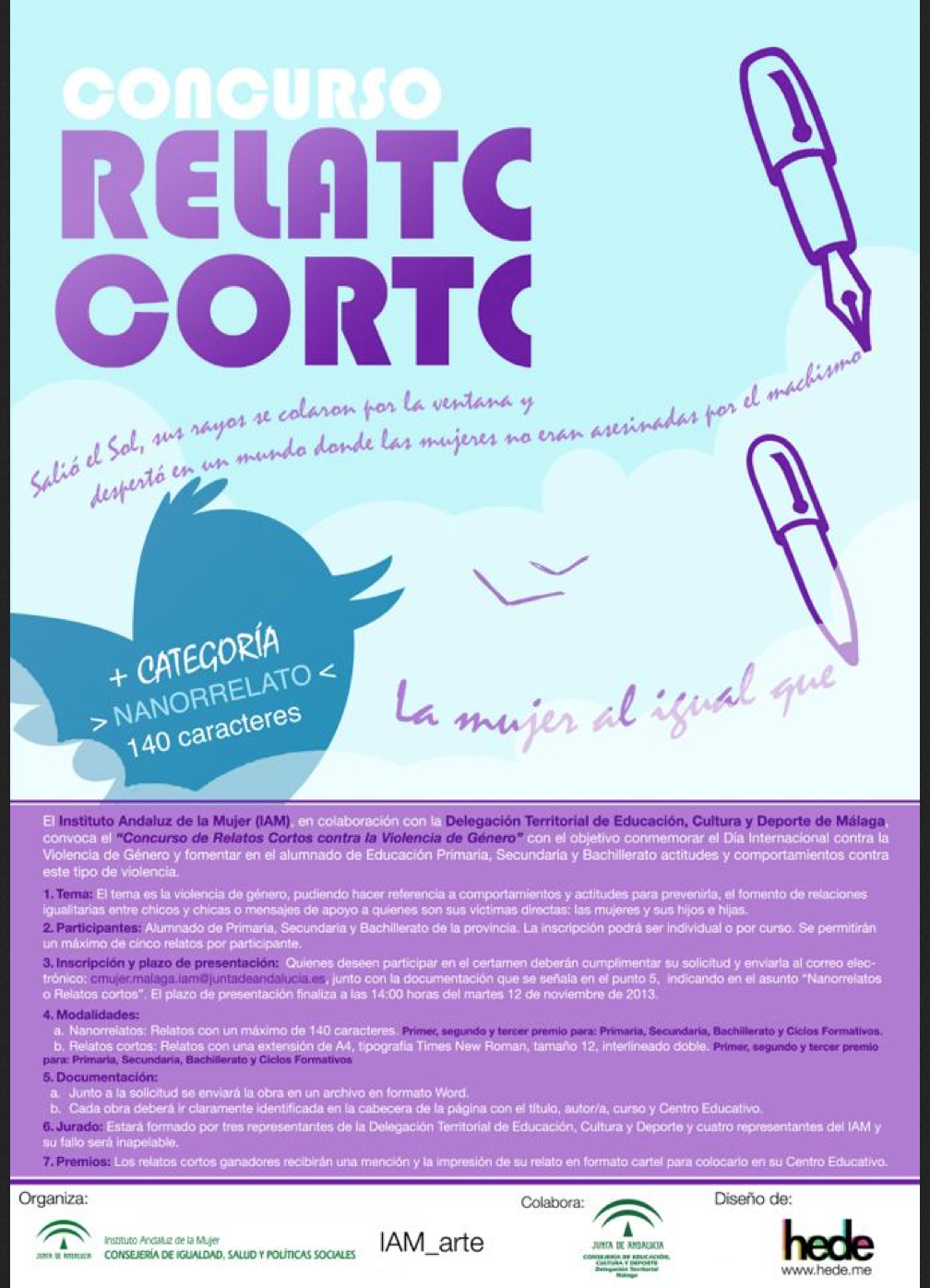 La Junta de Andalucía, a través del Instituto Andaluz de la Mujer (IAM) en Málaga y la Delegación Territorial de Cultura, Educación y Deporte, ha convocado un concurso de relatos cortos dirigido a los más jóvenes y cuyo objetivo fundamental es fomentar actitudes contra la violencia de género y erradicar los pensamientos sexistas.