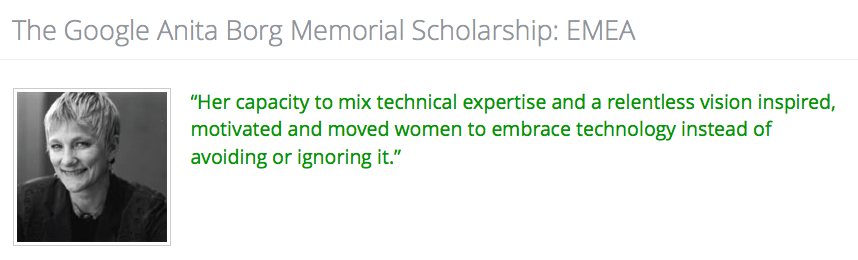 En memoria de ella, y con el objetivo de alentar a las mujeres a sobresalir en el mundo de la informática y la tecnología, se ha creado la Beca Google Anita Borg Memorial para Europa, Oriente Medio y África.