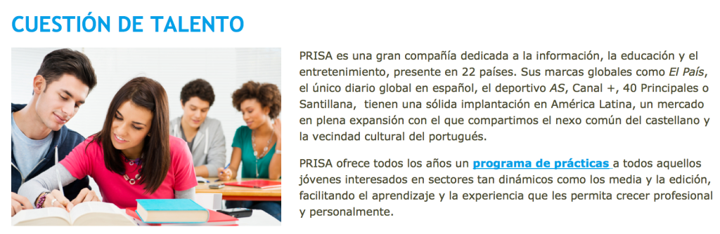 Para ello, desde hace años mantiene un dinámico plan de colaboración, aplicable en España, con numerosas instituciones académicas, públicas y privadas. A través de diversos convenios educativos con universidades, centros de formación e institutos de enseñanza secundaria, el departamento de Recursos Humanos de PRISA canaliza todas las peticiones que se reciben por parte de decenas de alumnos solicitando la realización de prácticas en las diferentes unidades de la compañía.