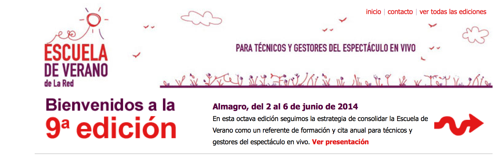 Para todo ello contamos de nuevo con la colaboración del Centro de Tecnología del Espectáculo (CTE) , la Escuela Superior de Técnicas de las Artes del Espectáculo de la Diputación de Barcelona (ESTAE) y la Agencia Andaluza de Instituciones Culturales ( ESCENICA).La Escuela de Verano de La Red 2014 contará con un programa de cursos-talleres prácticos dirigidos a gestores de teatros (públicos y privados),compañías, productores, distribuidores etc., técnicos y personal de cara al público en los espacios escénicos.