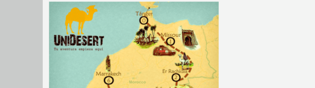 El próximo mes de febrero arranca una nueva edición de UniDesert, una aventura por el desierto marroquí, dirigida a universitarios de toda España. A los mandos de un vehículo antiguo, los equipos deberán superar un raid entre Tánger y Marrakech con la ayuda de una brújula y un roadbook. Una aventura que cuenta con la colaboración de Universidades de toda España.