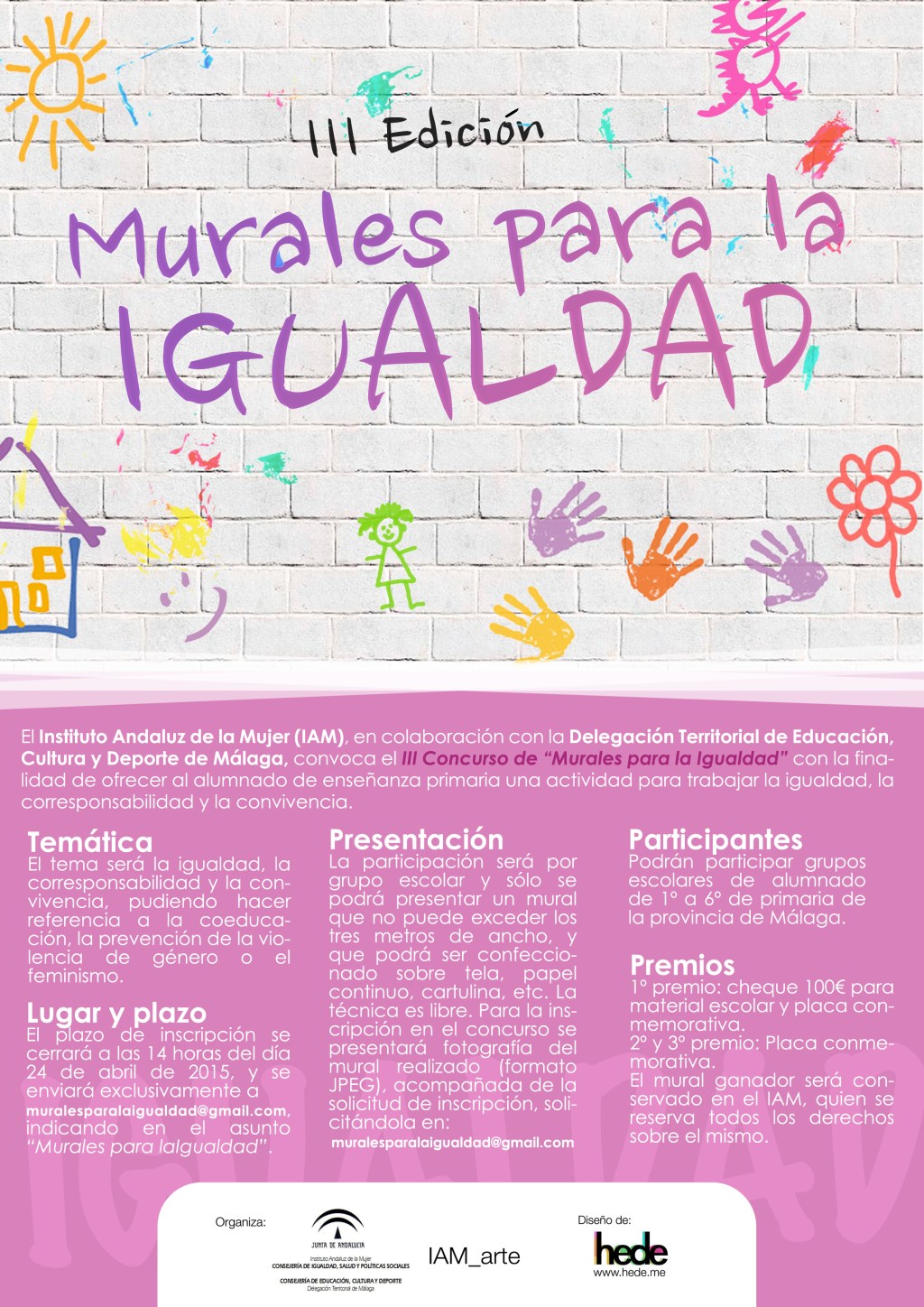 Nueva colaboración desde nuestra entidad, HEDE, con el Instituto Andaluz de la Mujer y la Delegación Territorial de Educación, Cultura y Deporte de Málaga para la tercera edición del certamen «Murales para la Igualdad», que tiene la finalidad de ofrecer al alumnado de enseñanza primaria una actividad creativa para trabajar la igualdad, la corresponsabilidad y la convivencia.